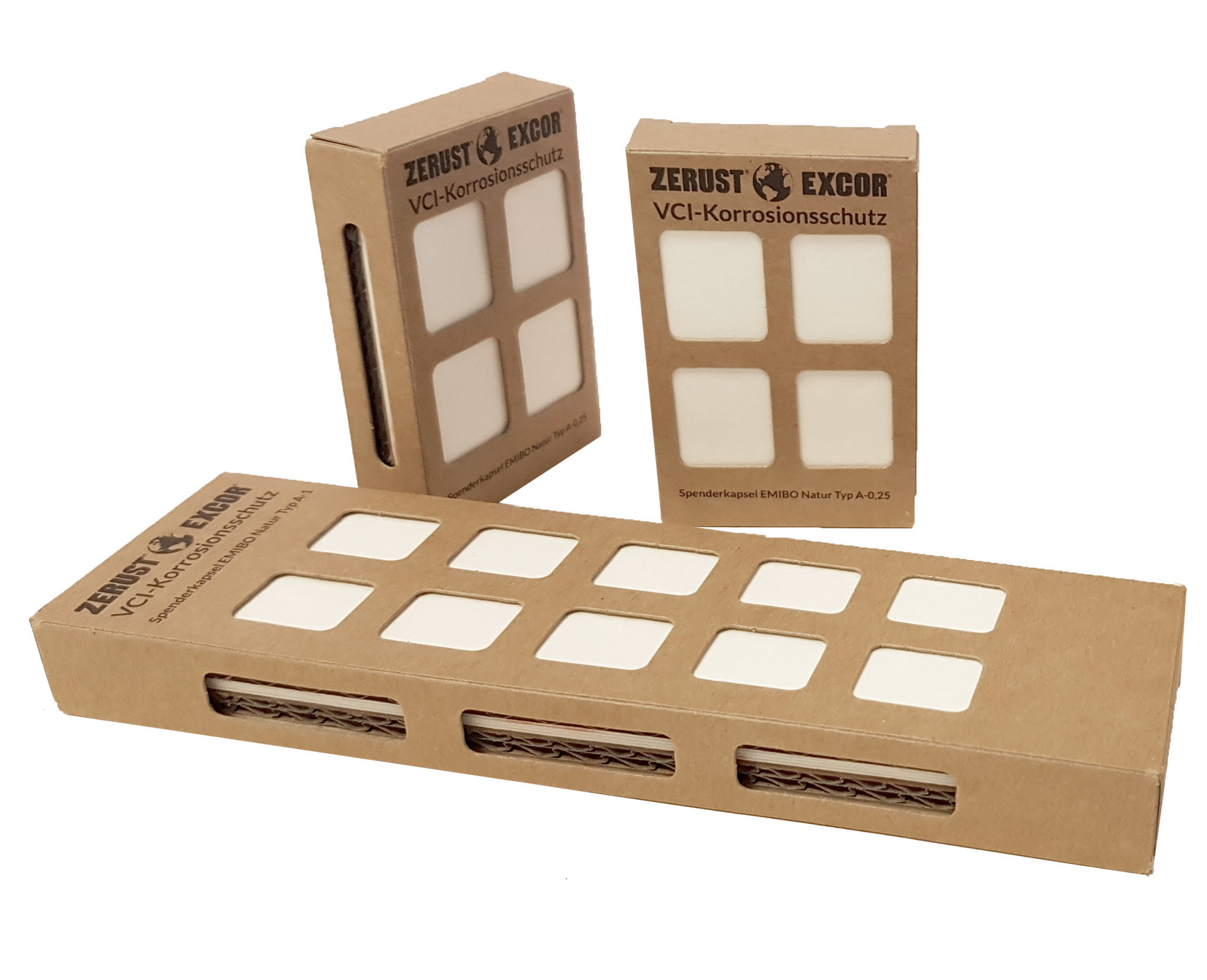EMIBO® Natur consists of a cardboard box with perforated windows on both sides. Inside, three separate layers of filter paper form a solid VCI deposit. The layers are connected to each other by cutting the intermediate layers, thus ensuring a continuous supply of VCI.