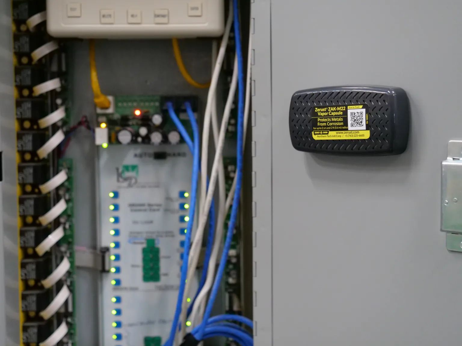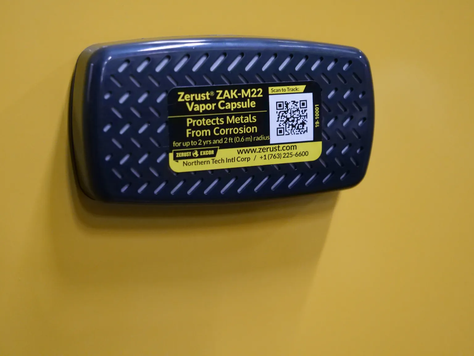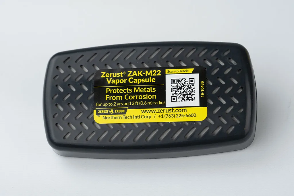 Zerust® ZAK-M22 capsules are rigid-shell VCI diffusers with adhesive backing. The capsules provide targeted corrosion protection and are used to protect electronics, electrical components, and the interior of cases such as musical instrument cases. Their VCI chemistry acts quickly and is effective in neutralizing contaminants.